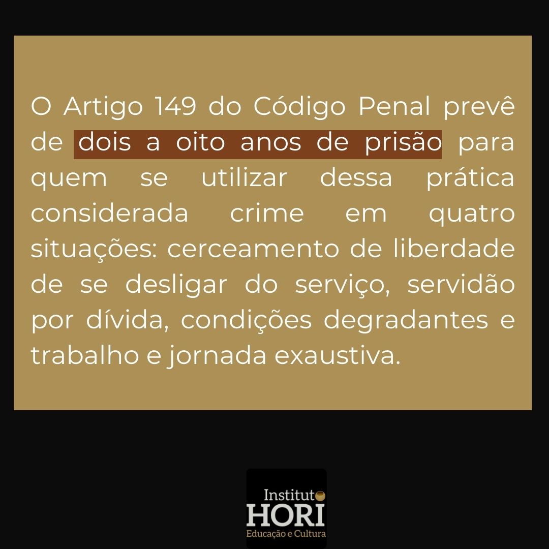 O Artigo 149 do Código Penal prevê de dois a oito anos de prisão para quem se utilizar dessa prática considerada crime em quatro situações: cerceamento de liberdade de se desligar do serviço, servidão por dívida, condições degradantes e trabalho e jornada exaustiva.